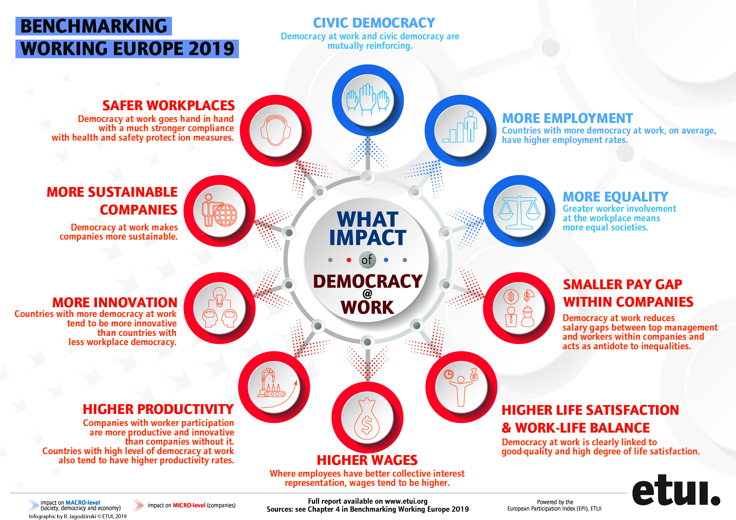 The ETUI’s recent research on the matter demonstrates numerous positive links of democracy at work to, among others, increased democratic involvement of citizens at large; better health and safety protection of workers; more equality; more sustainability; and higher productivity (see also ETUC and ETUI (2019) Benchmarking Working Europe, Chapter 4 and this graphical online presentation (in Prezi). Furthermore, research on the impacts and inter-linkages of democracy at work and workers’ participation has been an innovative stream of analysis by the ETUI, with the development of the European Participation Index (EPI) since 2010.